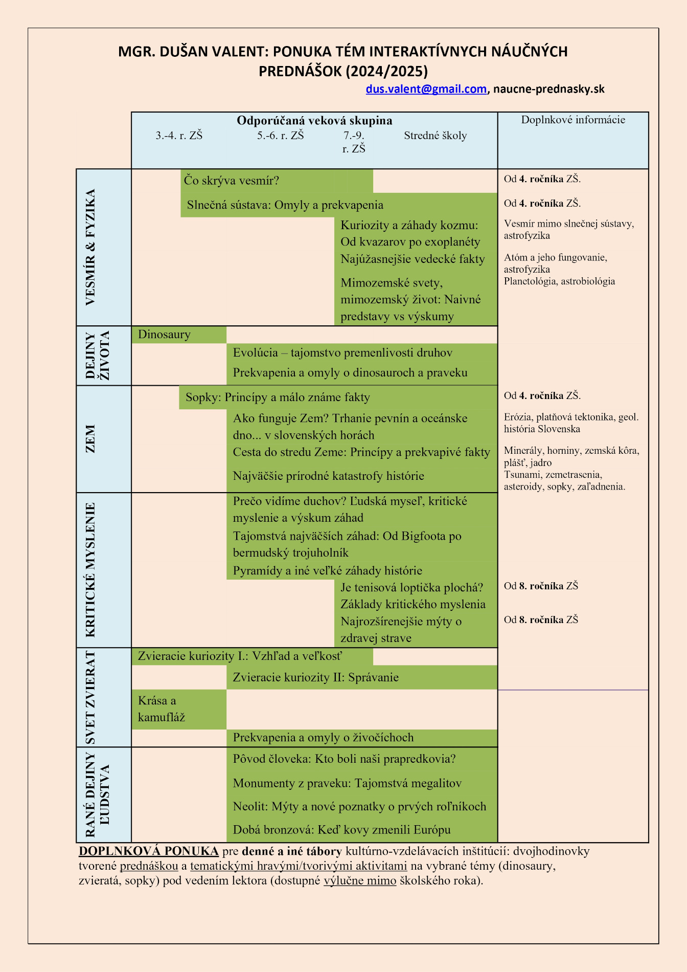 Zaujímavé témy, ich pútavé spracovanie, skvelý prístup k deťom. Aj takto by sme mohli charakterizovať prednášky pána Valenta. Veľa sme sa naučili, veľa nového sme zistili, ale aj sme sa pobavili. Prednášky odporúčame rôznym vekovým kategóriám. Sú poučné a nenásilnou formou žiakov vtiahnu do danej odbornej témy.